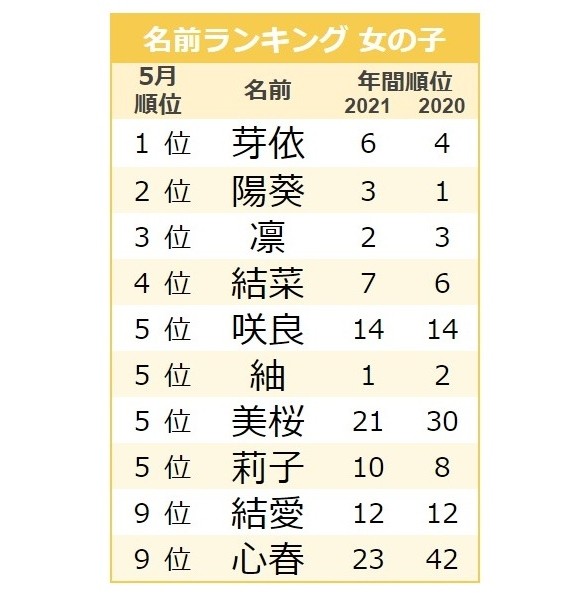 5月人気1位はやはり 芽依 その理由とは 5月生まれの女の子人気ランキングtop10 ベビーカレンダー
